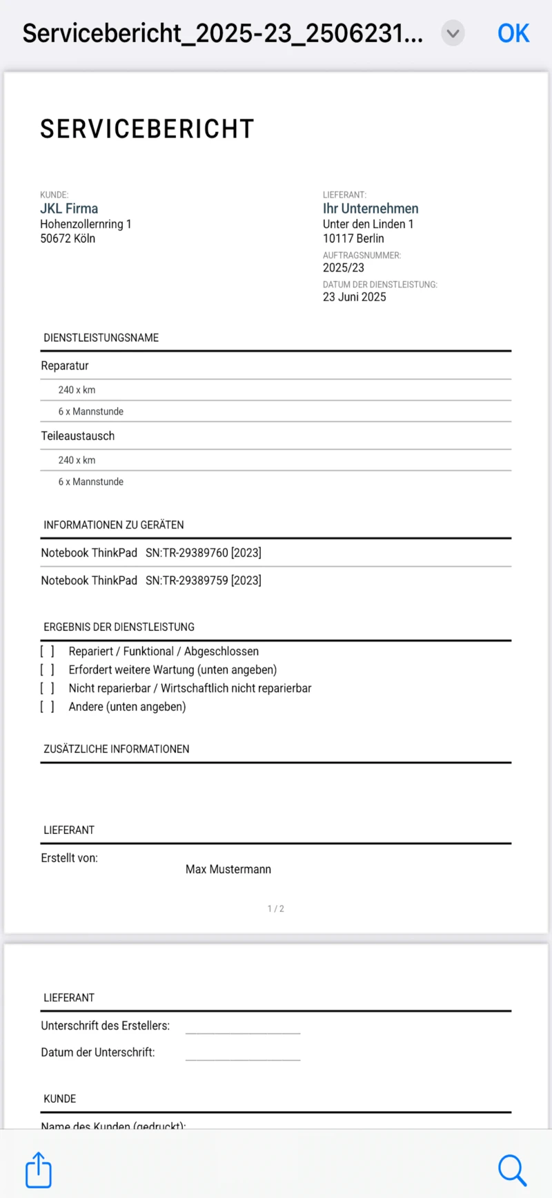 - Dokumente aus vorgefertigten Vorlagen generieren – Kostenvoranschlag, Servicebericht und Rechnung,