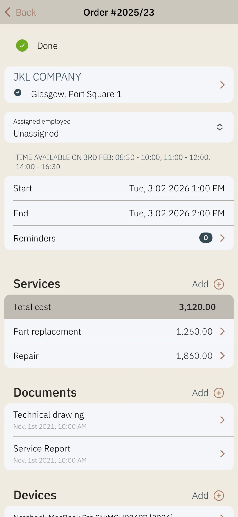 - assign devices to the order,
