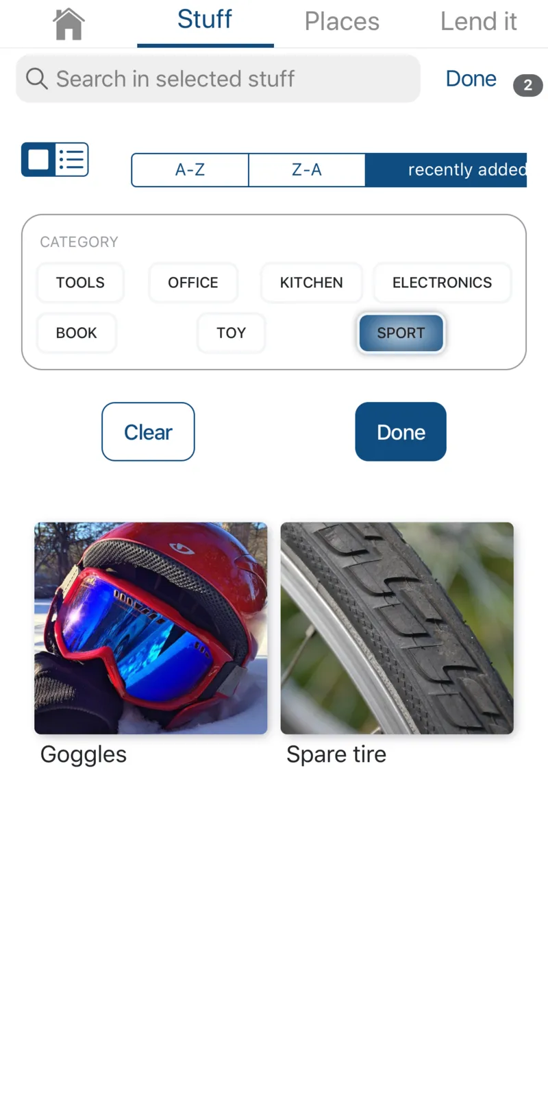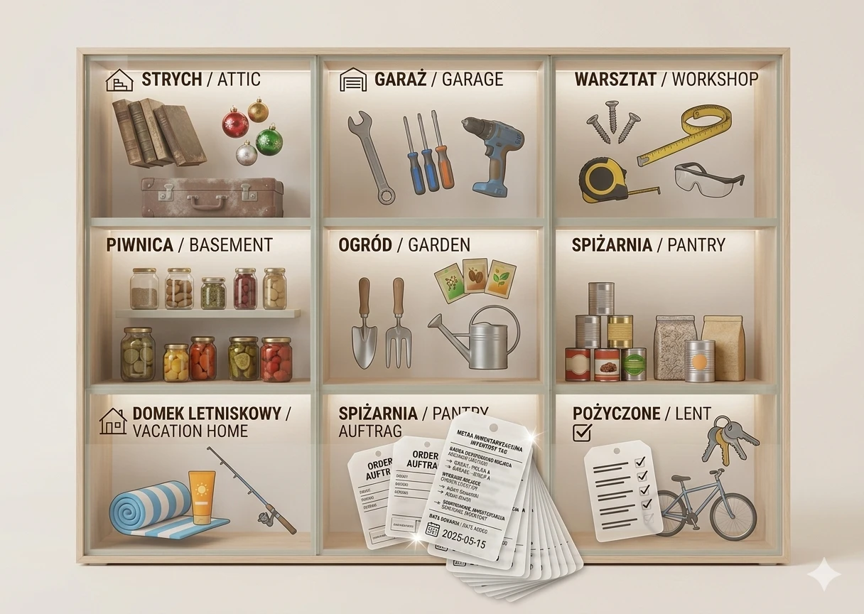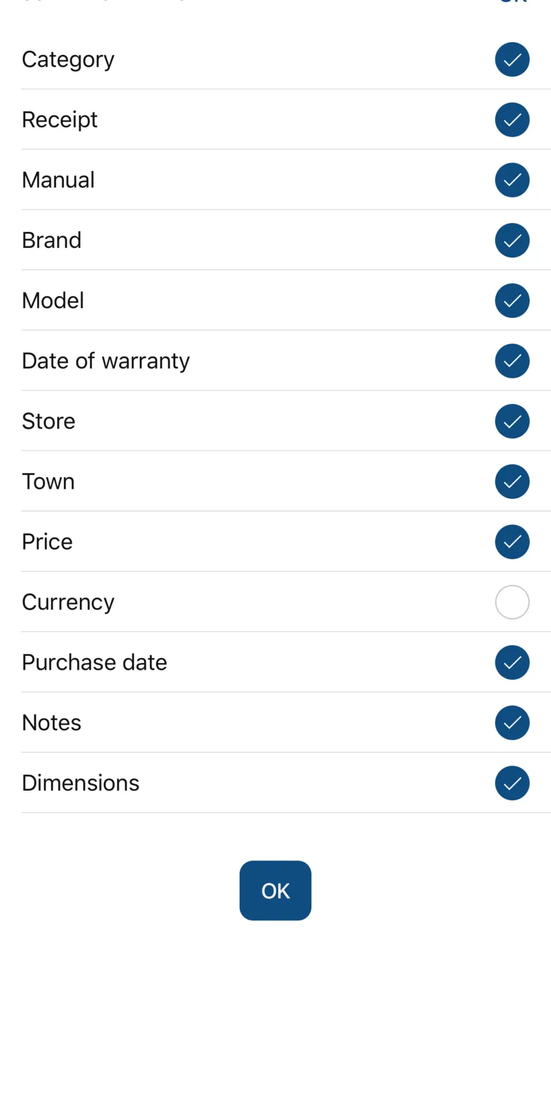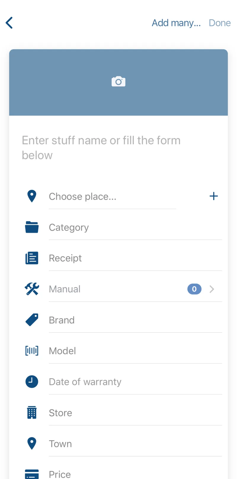 - Describe your stuff with: category, receipt, manual, brand, model, date of warranty, store name, town, price, currency, purchase date, dimensions, custom notes (each of these is of course optional :) ),